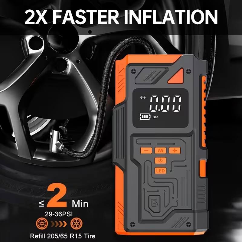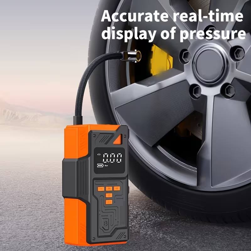 The 5-In-1 Multifunctional Air Compressor is a compact, all-in-one emergency automotive device combining a 150 PSI digital tire inflator, battery jump starter, air compressor, LED flashlight, and safety hammer. Engineered for 10L gasoline and 9.0L diesel vehicles, it features fast inflation, preset pressure control, and full auto-stop for safe, accurate operation. Supplied with multiple adaptors and a rugged orange ABS housing, it is ideal for roadside readiness.