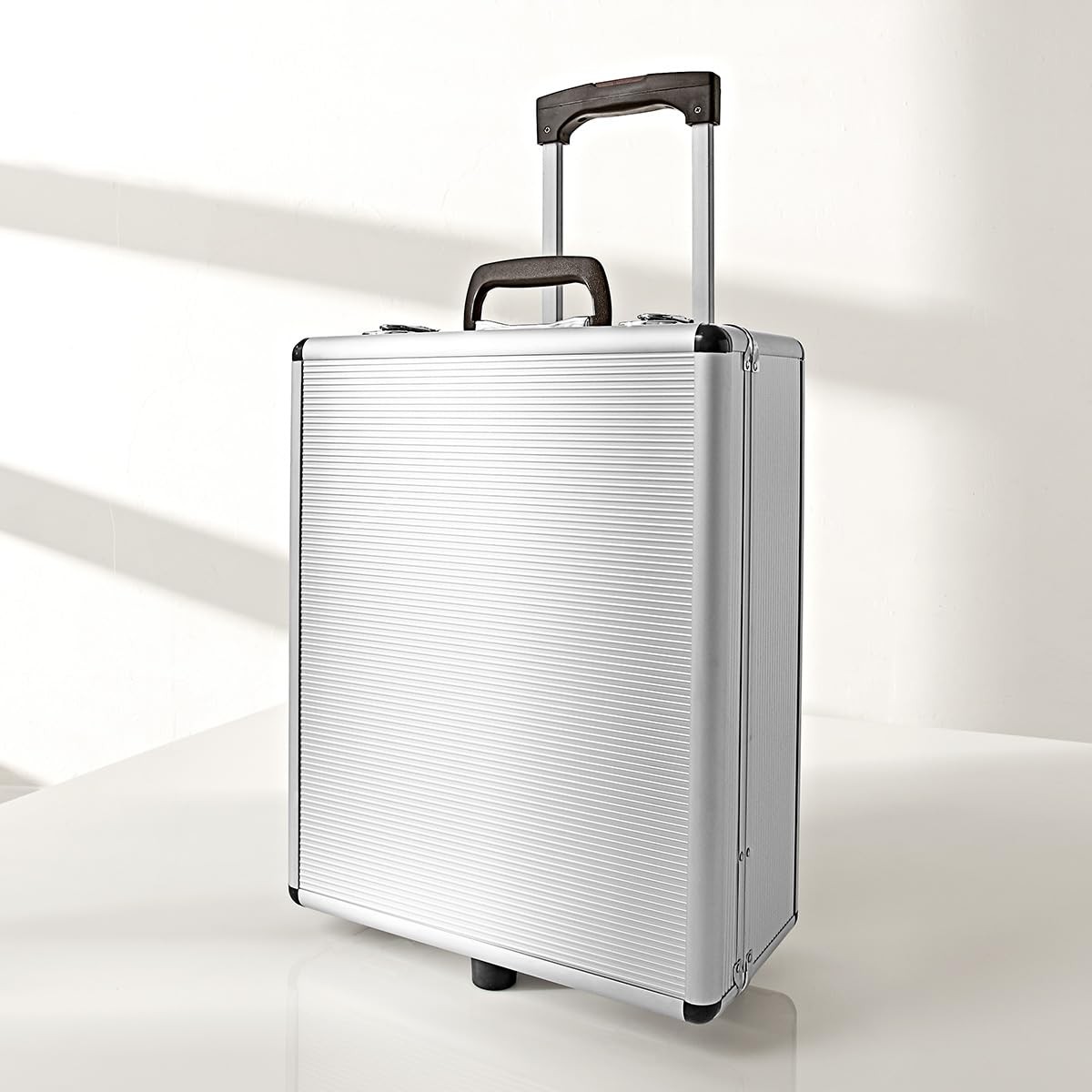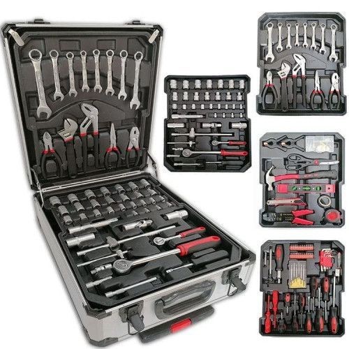 Tools are stored in a wheeled aluminum case, arranged in four removable trays. Includes screwdrivers, hex keys, pliers, metric wrenches, metric socket wrenches, a hammer and much more.
