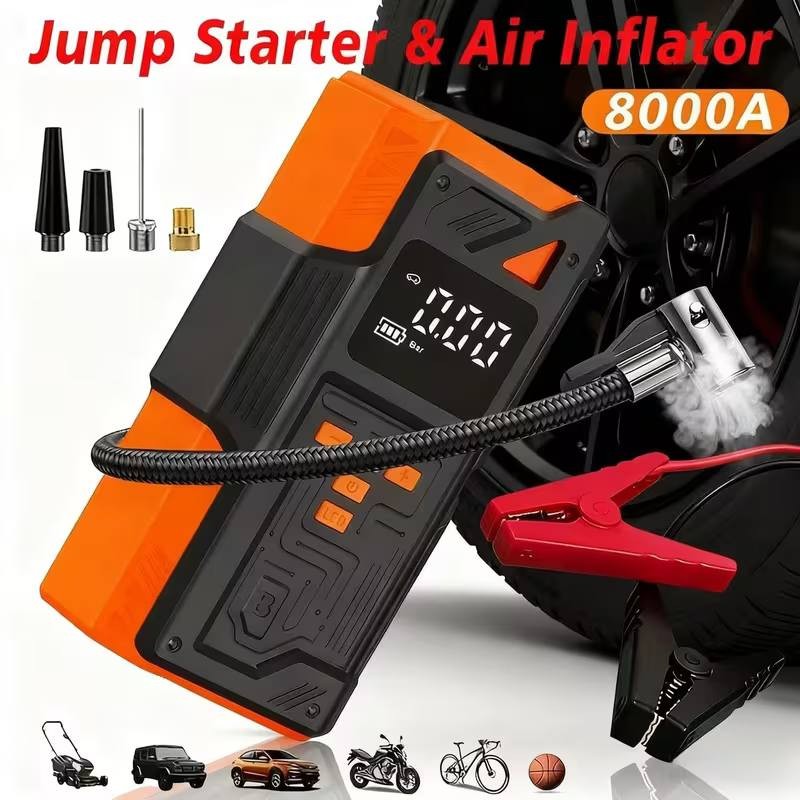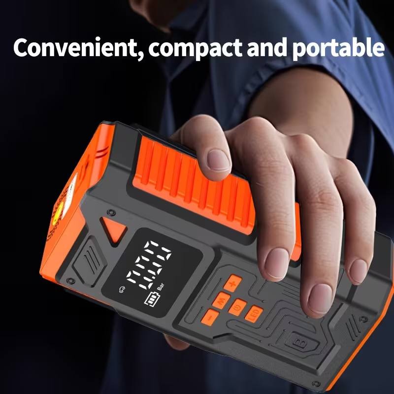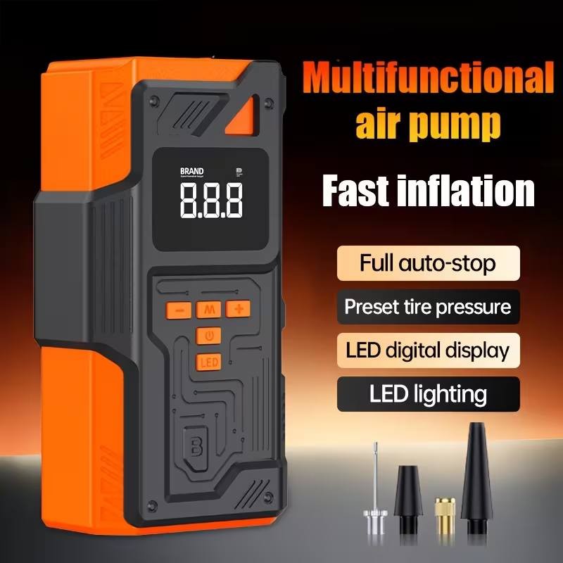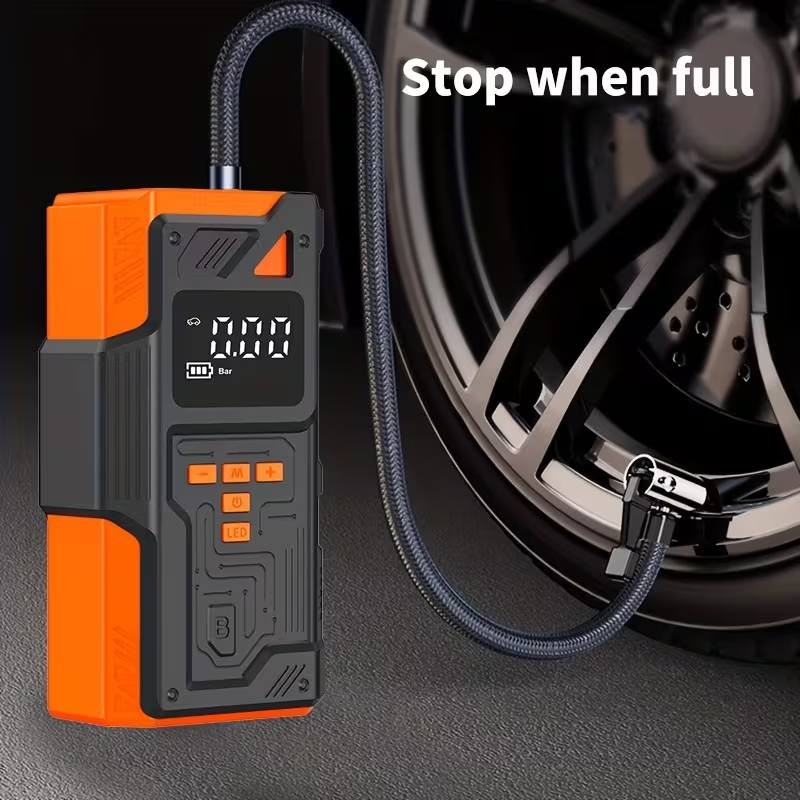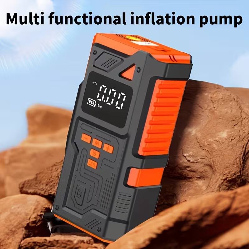 The 5-In-1 Multifunctional Air Compressor is a compact, all-in-one emergency automotive device combining a 150 PSI digital tire inflator, battery jump starter, air compressor, LED flashlight, and safety hammer. Engineered for 10L gasoline and 9.0L diesel vehicles, it features fast inflation, preset pressure control, and full auto-stop for safe, accurate operation. Supplied with multiple adaptors and a rugged orange ABS housing, it is ideal for roadside readiness.