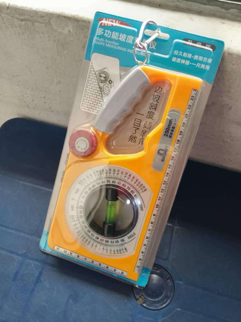 This mechanical inclinometer angle slope meter is a precision tool designed for measuring angles, slopes, rise, and fall in construction, engineering, and installation work. It features a clearly marked circular angle scale combined with a built-in bubble level for reliable, non-electronic measurement. The robust plastic body includes a comfortable handle for easy positioning and handling on site.