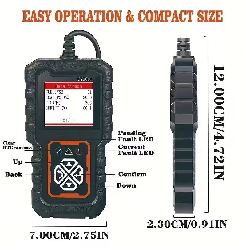 The CY3001 OBD2 Scanner is a compact, professional-grade engine fault code reader designed for fast and accurate vehicle diagnostics. Compatible with all OBD II protocol vehicles manufactured since 1996, it reads and clears engine fault codes, displays live data, and helps drivers understand check engine warnings instantly. Ideal for DIY users and professionals, it delivers reliable diagnostics without recurring mechanic costs.