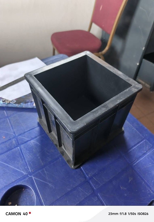 A reusable plastic mould used to cast 150mm x 150mm concrete cubes for compressive strength testing in construction.