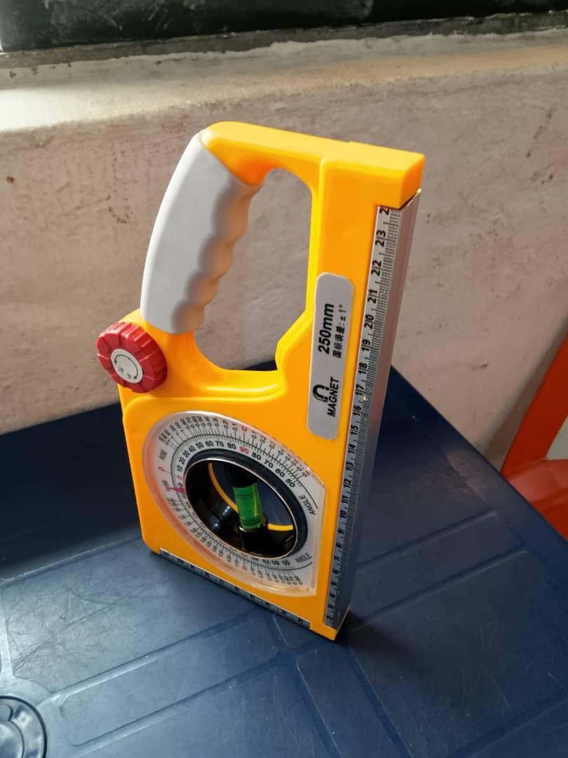 This mechanical inclinometer angle slope meter is a precision tool designed for measuring angles, slopes, rise, and fall in construction, engineering, and installation work. It features a clearly marked circular angle scale combined with a built-in bubble level for reliable, non-electronic measurement. The robust plastic body includes a comfortable handle for easy positioning and handling on site.